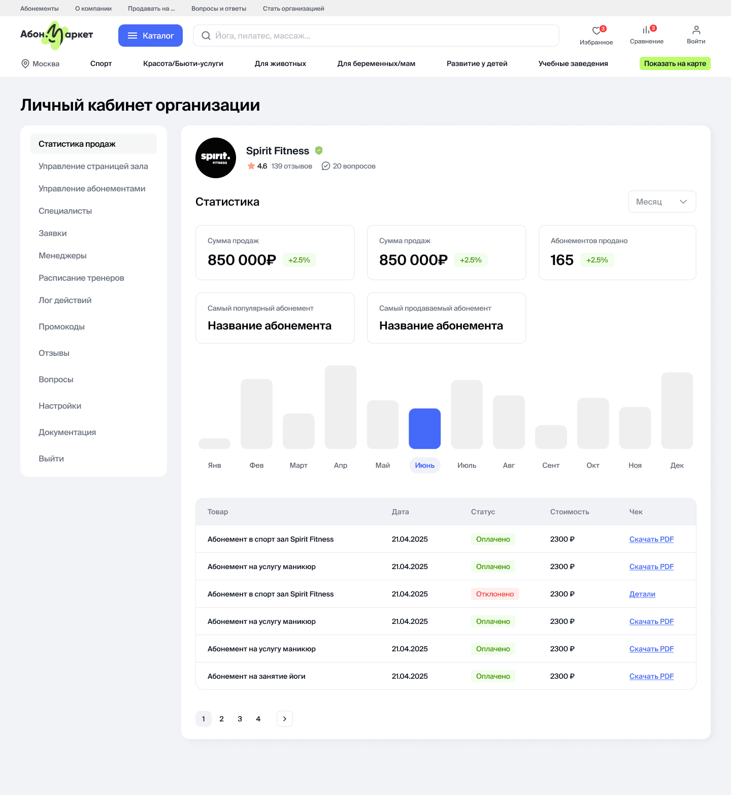 Управление абонементами, ценами, расписаниемСтатистика, аналитика и рейтингиФилиалы, заморозки, передачаКоммуникация с пользователямиНастройка уведомлений по событиям: покупки, заморозки, вопросыДоступ к актам, отчётам и необходимым юридическим документам